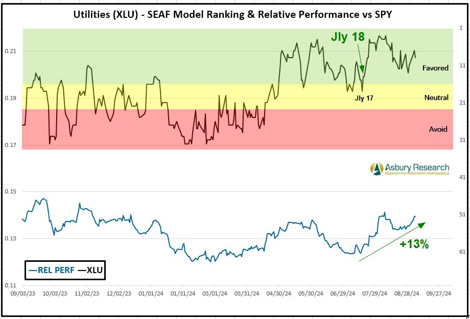 Defensive Utilities (XLU) is the SEAF Model’s third-ranked sector this week with a Ranking score of 9. XLU has also been one of the three best-ranked sectors of the S&P 500 according to the SEAF Model for eight of the past nine weeks beginning on Jly 15th. Chart 3 below shows that Utilities has been on a Favored status according to SEAF since Jly 18th (upper panel) while XLU has coincidentally outperformed the the benchmark S&P 500 (SPY) by 13%.