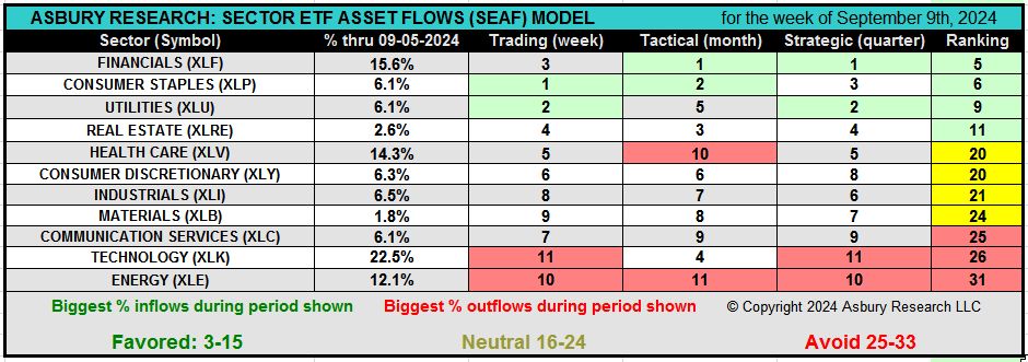 In the SEAF Model Graphic below, the Ranking column sorts the entire table of 11 sector ETFs according to the sum of rankings in the Trading (weekly), Tactical (monthly), and Strategic (quarterly) categories, from largest inflows to largest outflows. The premise of the model is to invest in the sectors that the money is going into and to avoid the sectors the money is coming out of.