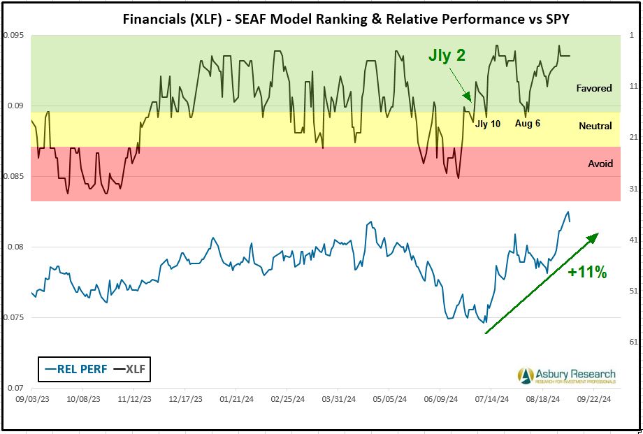 Cyclical Financials (XLF) is currently the SEAF Model’s top-ranked sector with a Ranking score of 5. Financials has been one of the three best-ranked sectors of the S&P 500 according to the SEAF Model for the past nine of 10 weeks beginning on Jly 8th. Chart 1 below shows that Financials has essentially maintained a Favored SEAF Ranking since Jly 2nd (upper panel) while XLF has coincidentally outperformed the S&P 500 (SPY, lower panel) by 11%.