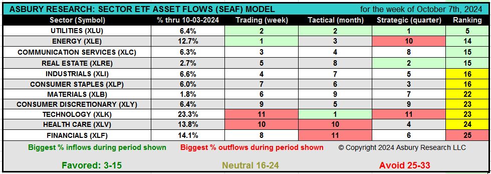 This weekly video by Jack Kosar, MSF, goes into more detail on the latest SEAF Model data via a heat map that shows where sector-related assets are going, and where they are leaving, in the 11 Sector SPDR ETFs, and also dissects our SEAF “Rainbow Charts” which display the past 12 months of Favored, Neutral, or Avoid rankings in several key market sectors.