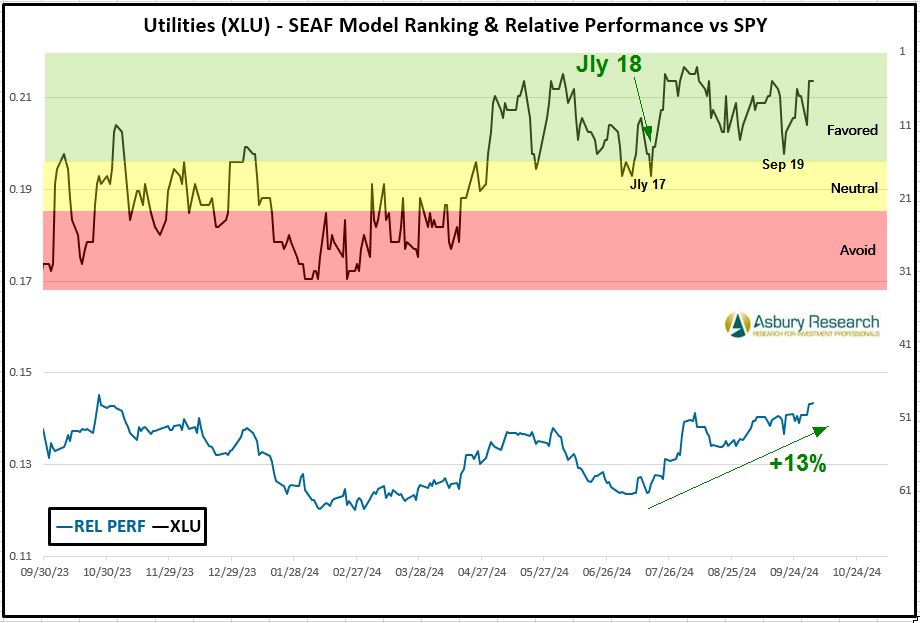 This week, the SEAF Model retains its Sep 30th overweight bias in Utilities, which has traditionally been a defensive sector but what some market observers now consider to be a new “risk on” sector due to AI’s upcoming need for more infrastructure to power this new technology. The other top-ranked sectors this week are economically sensitive Energy (XLE) and Communication Services (XLC). At the other end of the spectrum, defensive Health Care (XLV) and cyclical Financials (XLF) are the worst-ranked sectors according to SEAF.