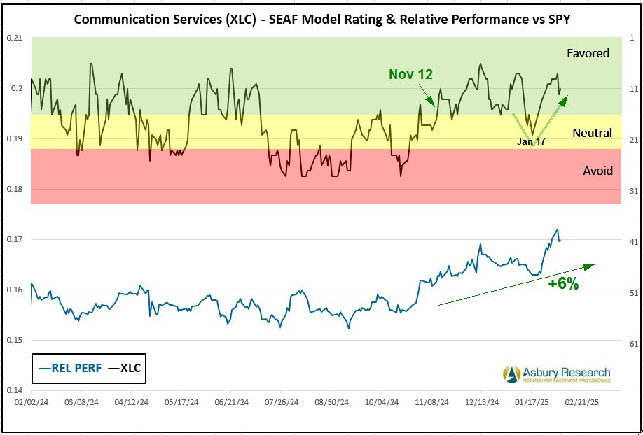 Economically sensitive Communication Services (XLC) is the SEAF Model’s second-best-ranked sector this week with a Ranking score of 11. The green highlights in the upper panel of Chart 2 below show that, with the brief exception of a few days around Jan 17th when the SEAF Ranking score briefly dipped into Neutral status, Communication Services has maintained a Favored ranking since Nov 12th. The lower panel shows that XLC has outperformed the S&P 500 (SPY) by 6% during this 3-month period.