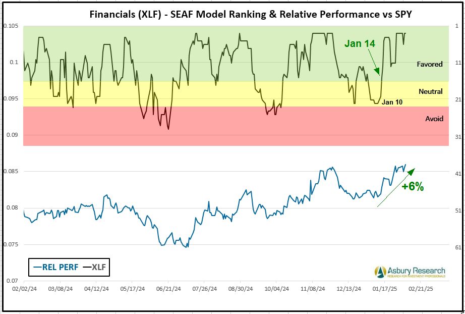 Cyclical Financials (XLF) is again the SEAF Model’s top-ranked sector this week with a Ranking score of 3, which is the best Ranking score possible and indicative of aggressive asset inflows across the board. The rightmost green highlights in Chart 1 below show that Financials moved into Favored status on Jan 14th (upper panel) as the daily relative performance chart of XLF versus the benchmark S&P 500 responded with as much as 6% of relative outperformance versus the benchmark S&P 500 (SPY).