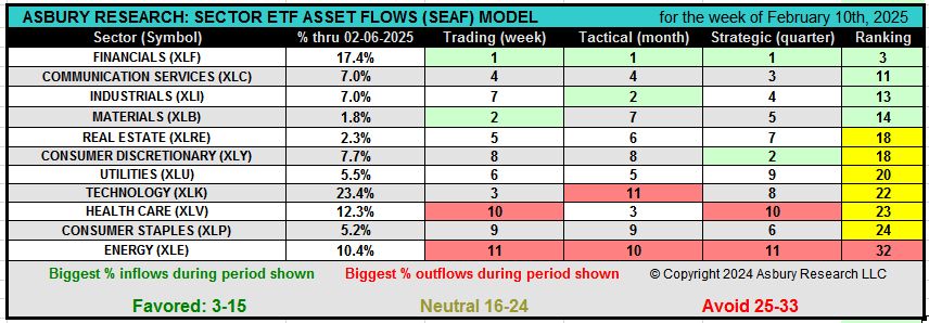 This weekly video by Jack Kosar goes into more detail on the latest SEAF Model data via a heat map that shows where sector-related assets are going, and where they are leaving, in the 11 Sector SPDR ETFs, and also dissects our SEAF “Rainbow Charts” which display the past 12 months of Favored, Neutral, or Avoid rankings in several key market sectors.