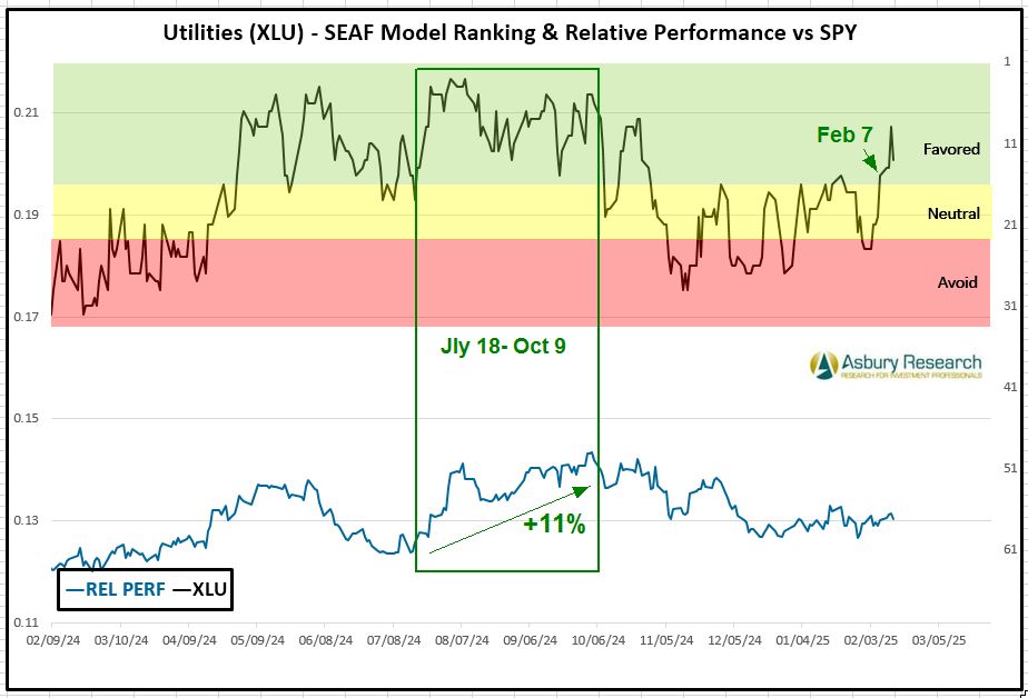 Defensive Utilities (XLU) is the SEAF Model’s third-ranked sector this week with a Ranking score of 13. The rightmost green highlights in the upper panel of Chart 3 below show that Utilities moved back into Favored status on Feb 7th, after spending most of its time as a Favored sector between May and October of last year. The green highlights in the middle of the chart show that Utilities’ favored status between Jly 18th and Oct 9th coincided with 11% of relative outperformance by XLU versus the benchmark S&P 500 (SPY) as investor assets aggressively moved into that sector.