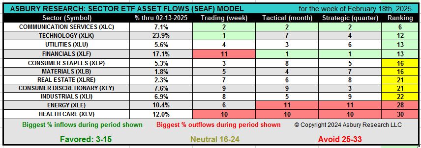 In the SEAF Model Graphic below, the Ranking column sorts the entire table of 11 sector ETFs according to the sum of rankings in the Trading (weekly), Tactical (monthly), and Strategic (quarterly) categories, from largest inflows to largest outflows. The premise of the model is to invest in the sectors that the money is going into and to avoid the sectors the money is coming out of.