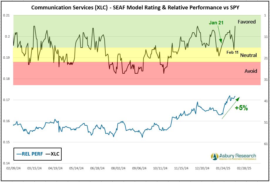 Economically sensitive Communication Services (XLC) is again the SEAF Model’s top-ranked sector this week with a Ranking score of 6. The green highlights in the upper panel of Chart 1 below show that Communication Services initially moved into Favored status on Jan 21st and, with the exception of Feb 11th, has remained there since. The lower panel shows that XLC has coincidentally outperformed the benchmark S&P 500 (SPY) by 5% during this. As long as Communication Services remains Favored by SEAF, XLC is likely to continue outperforming SPY.
