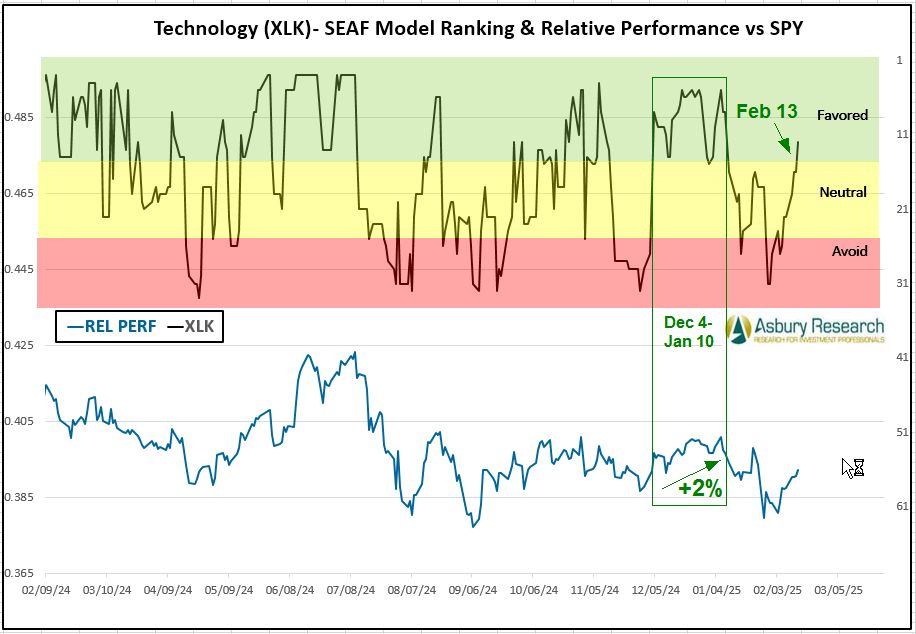 Economically sensitive Technology (XLK) is the SEAF Model’s second-ranked sector this week with a Ranking score of 12. Technology is also the top-ranked sector in the Trading time frame, which means it received the most aggressive inflow of new money over the previous week. The green highlights in the upper panel of Chart 2 below show that Technology very recently moved to Favored status, on Feb 13th, as XLK has coincidentally outperformed the benchmark S&P 500 (lower panel) as these asset flows improved. As long as Technology maintains its Favored status, as it most recently did between Dec 4th and Jan 10th, recent relative outperformance by Technology is likely to continue.