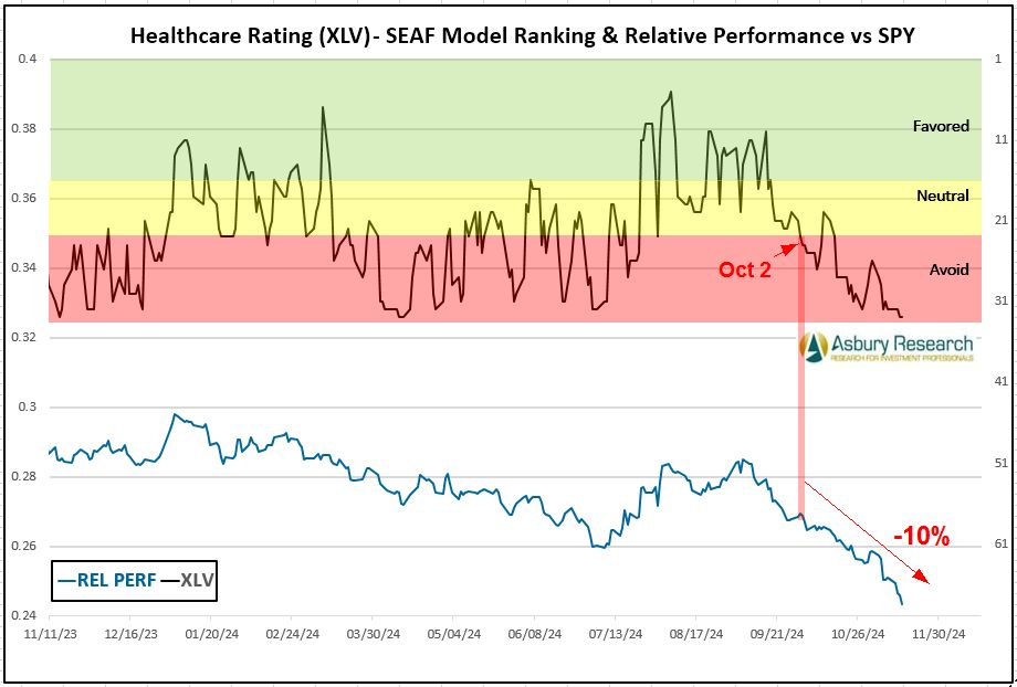 Defensive Health Care (XLV) is the SEAF Model’s worst-ranked sector this week with a Ranking score of 33, which is the worst SEAF Ranking possible. The red highlights in Chart 3 below show that Health Care initially dropped into Avoid status on Oct 2nd (upper panel) while XLV has coincidentally underperformed the S&P 500 (SPY) by 10%. As long as Health Care remains on a SEAF Model Avoid status, XLV is likely to continue underperforming the US broad market.
