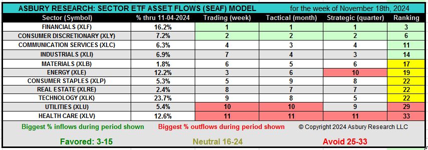 This weekly video by Jack Kosar, goes into more detail on the latest SEAF Model data via a heat map that shows where sector-related assets are going, and where they are leaving, in the 11 Sector SPDR ETFs, and also dissects our SEAF “Rainbow Charts” which display the past 12 months of Favored, Neutral, or Avoid rankings in several key market sectors.