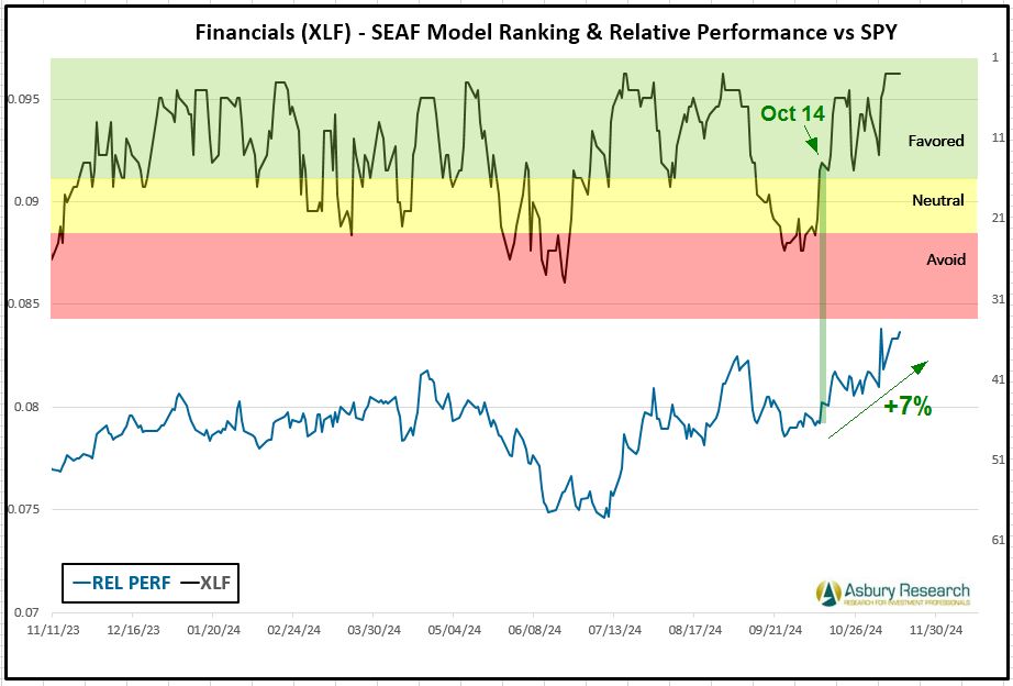 Cyclical Financials (XLF) is again the SEAF Model’s top-ranked sector this week with a Ranking score of 3, which is the highest ranking possible. The green highlights in the upper panel of Chart 1 below show that Financials moved into Favored status according to SEAF on Oct 14th, while the lower panel shows that XLF has coincidentally outperformed the S&P 500 (SPY) by 7%. As long as Financials maintains its Favored ranking according to SEAF, the more relative outperformance by XLF we are likely to see.