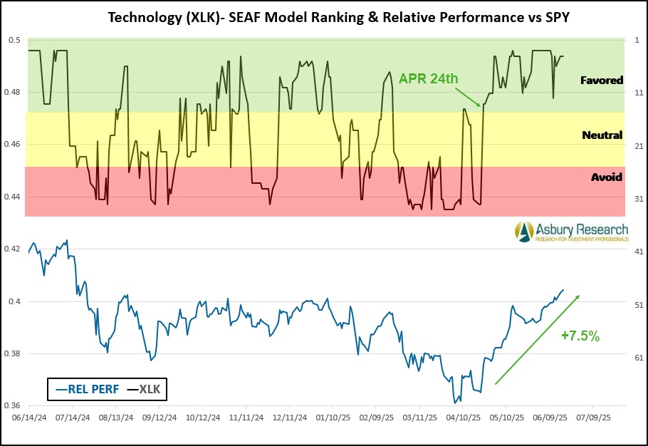 Economically sensitive Communication Services is the SEAF Model’s second-ranked sector this week with a Ranking score of 7. Communication Services has been a top-three-ranked sector according to SEAF for seven of the past nine weeks. Chart 2 below shows that Communication Services initially moved into Favored status on Apr 23rd (upper panel) while XLC has slightly outperformed the S&P 500 (SPY, lower panel) by 1.0%. Although Communication Services has not yet outperformed by a meaningful degree, history suggests that the longer this sector retains its current Favored status, the more likely that XLC will generate a significant period of relative outperformance versus SPY.