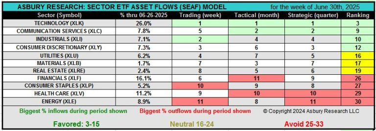This weekly video by Jack Kosar goes into more detail on the latest SEAF Model data via a heat map that provides more detail on where sector-related assets are going, and where they are leaving, in the 11 Sector SPDR ETFs. Jack also displays and discusses our SEAF “Rainbow Charts” highlighting SEAF’s past 12 months of Favored, Neutral, or Avoid rankings.