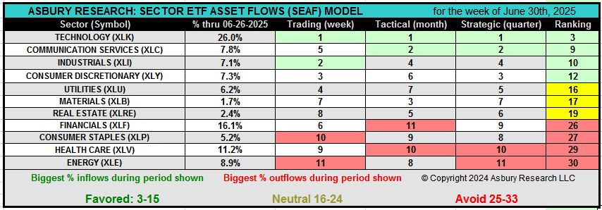 In the SEAF Model Graphic below, the Ranking column sorts the entire table of 11 sector ETFs according to the sum of rankings in the Trading (weekly), Tactical (monthly), and Strategic (quarterly) categories, from largest inflows to largest outflows. The premise of the model is to invest in the sectors where the money is going and to avoid the sectors where the money is coming out.