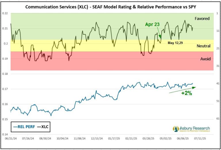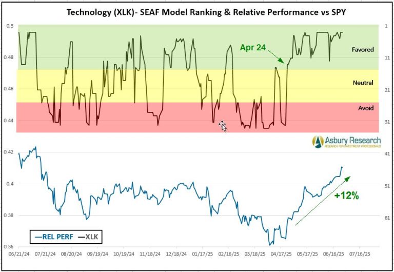 The SEAF Model graphic below shows that economically sensitive Technology (XLK), Communication Services (XLC), and Industrials (XLI) are the three top-ranked sectors this week. XLK has been SEAF’s top-ranked sector for eight of the past nine weeks and has outperformed the S&P 500 (SPY) by 12% since Apr 24th. XLC has been a top-three ranked sector for eight of the past ten weeks. XLI is a new addition to Favored status this week, and to a top-three ranking. At the other end of the spectrum, Energy (XLE) and defensive Health Care (XLV) are the two worst-ranked sectors according to SEAF, with XLV being one of the two worst-ranked sectors for the fourth consecutive week.