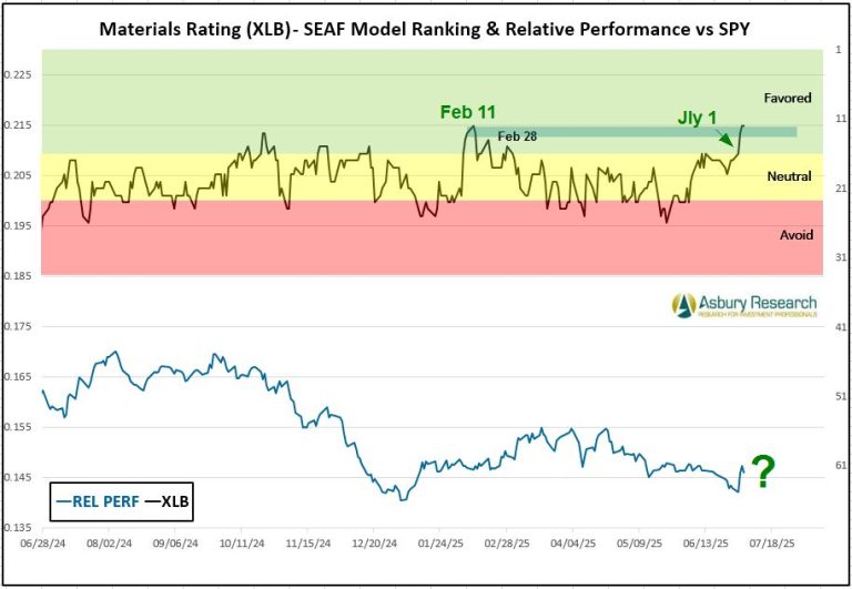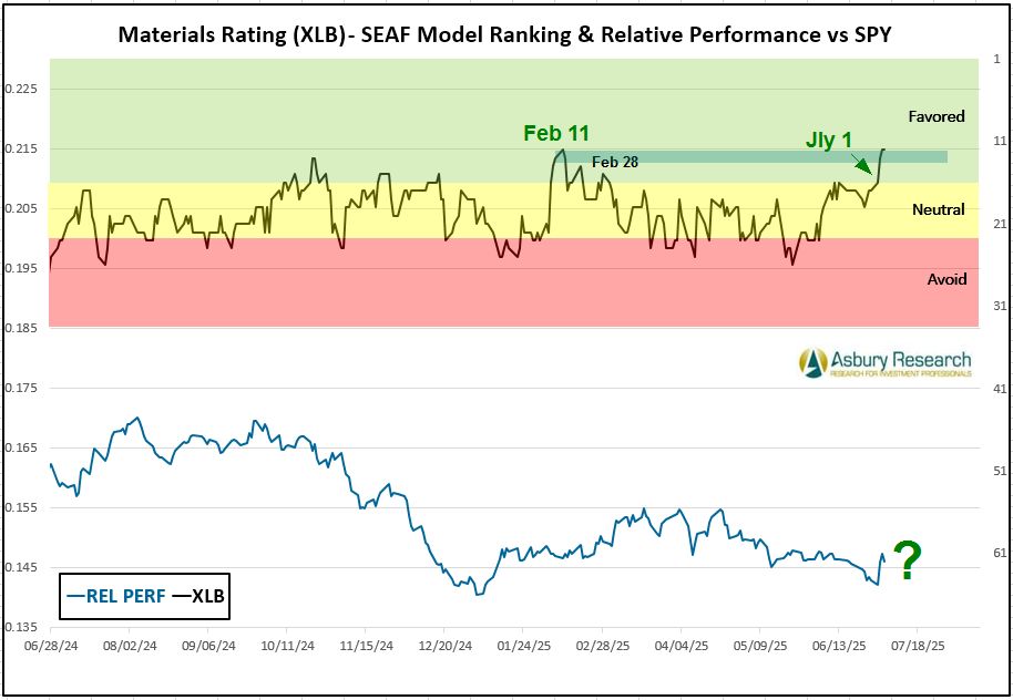 - Effective Monday 7/7, there is a new buy/overweight signal in the Materials Select Sector SPDR Fund (XLB).