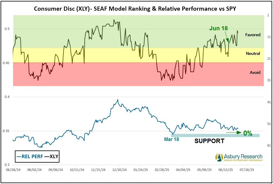 Cyclical Consumer Discretionary (XLY) is the SEAF Model’s second-ranked sector this week with a Ranking score of 9. The upper panel of Chart 2 below shows that Consumer Discretionary has most recently moved into Favored status according to SEAF on Jun 18th. The lower panel shows that XLY has just managed to be a relative performer versus the benchmark S&P 500 (SPY) since then. However, the green highlights show there is relative support just below the market, which could become the starting point of the next relative outperformance trend.