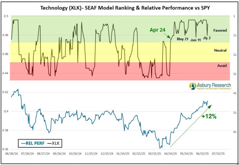 The SEAF Model generally remains in a “risk on” alignment this week. Economically sensitive Technology (XLK) is once again the SEAF Model’s top-ranked sector, and has been so for nine of the past eleven weeks. The second and third-ranked sectors, cyclical Consumer Discretionary (XLY) and Materials (XLB), are new additions to the top three this week. At the other end of the spectrum, defensive Health Care (XLV) and Consumer Staples (XLP) are the two worst-ranked sectors according to SEAF.