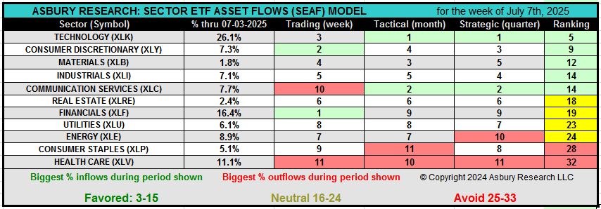 In the SEAF Model Graphic below, the Ranking column sorts the entire table of 11 sector ETFs according to the sum of rankings in the Trading (weekly), Tactical (monthly), and Strategic (quarterly) categories, from largest inflows to largest outflows. The premise of the model is to invest in the sectors where the money is going and to avoid the sectors where the money is coming out.