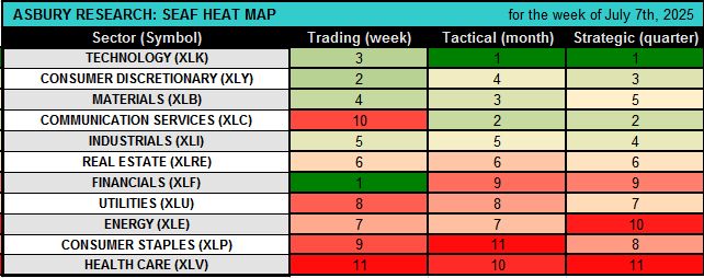 This weekly video by Jack Kosar goes into more detail on the latest SEAF Model data via a heat map that provides more detail on where sector-related assets are going, and where they are leaving, in the 11 Sector SPDR ETFs. Jack also displays and discusses our SEAF “Rainbow Charts” highlighting SEAF’s past 12 months of Favored, Neutral, or Avoid rankings.