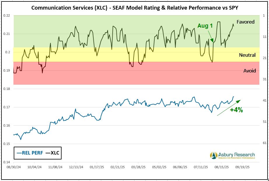 Economically sensitive Communication Services (XLC) is the SEAF Model’s top-ranked sector this week with a Ranking score of 6, up from 11 a week earlier. The upper panel of Chart 3 below shows that Communication Services initially moved back into Favored status on August 1st, while the lower panel shows that XLC has coincidentally outperformed the benchmark S&P 500 (SPY) by 4%. Year-to-date, according to sectorspdrs.com, XLC is currently the best-performing Sector SPDR ETF, rising by 18.5% while outperforming the S&P 500 (SPY) by 8.3%.