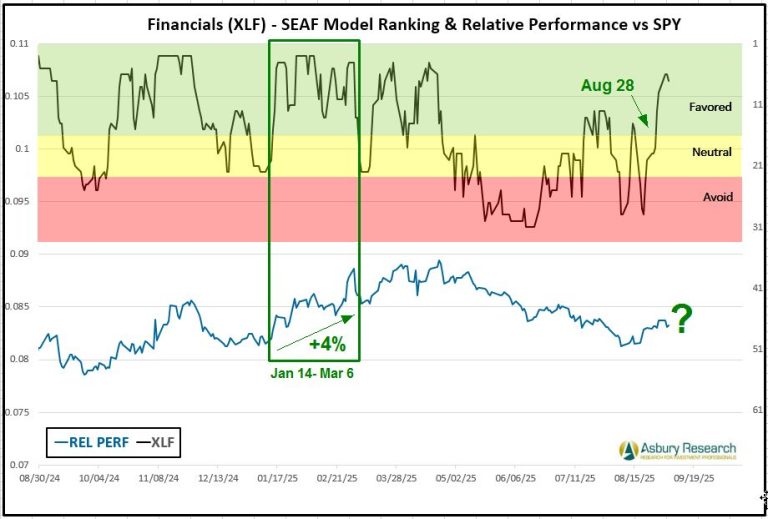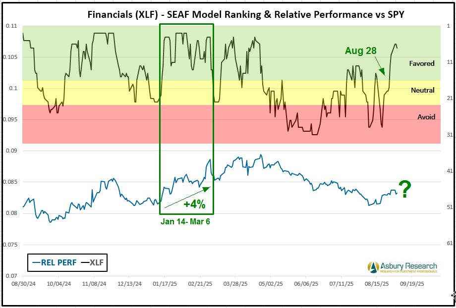 - Effective Monday 9/8, there is a new buy/overweight signal in the Financial Select Sector SPDR Fund (XLF).