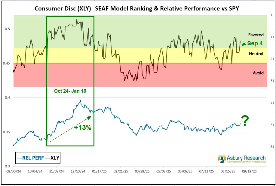 Cyclical Consumer Discretionary (XLY) is the SEAF Model’s third-best-ranked sector this week with a Ranking score of 13, down slightly from its score of 11 a week earlier. The rightmost green highlights show that Consumer Discretionary moved back into Favored status on Sep 4th, after moving in and out of Favored two weeks earlier. A sustained period of time in Favored status, as occurred between late October 2024 and Jan 10th while XLY outperformed SPY by 13%, would be necessary for recent relative outperformance by Consumer Discretionary to continue. Year-to-date (YTD), according to sectorspdrs.com, XLY is the seventh-best (or fifth-worst) performing Sector SPDR ETF, rising by 4.8% while underperforming SPY by 5.4%.