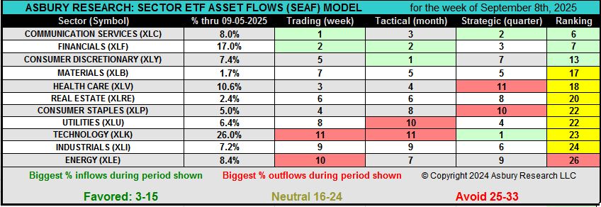 The charts below display the weekly SEAF Model Ranking Scores over the previous 12 months for the strongest and weakest sectors through September 12th. The line in the upper panel displays these weekly scores within the context of being Favored (3-15, green), Neutral (16-24, yellow), or Avoid (25-33, red) and also displays the trend of asset flows as the money moves in and out of these sectors. The lower panel plots the corresponding weekly relative performance chart of that particular sector versus the S&P 500 (SPY).