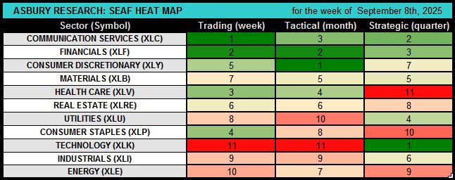 This weekly video by Jack Kosar goes into more detail on the latest SEAF Model data via a heat map that provides more detail on where sector-related assets are going, and where they are leaving, in the 11 Sector SPDR ETFs. Jack also displays and discusses our SEAF “Rainbow Charts” highlighting SEAF’s past 12 months of Favored, Neutral, or Avoid rankings.