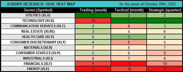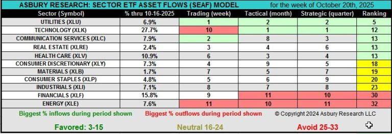This weekly video by Jack Kosar goes into more detail on the latest SEAF Model data via our SEAF Rainbow Charts and a heat map that provide more color and detail on where sector-related assets are going, and where they are coming from, in the 11 Sector SPDR ETFs which together comprise the S&P 500. Our Rainbow Charts highlight SEAF’s previous 12 months of Favored, Neutral, and Avoid rankings.