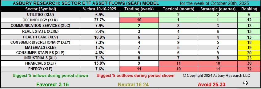The charts below display the weekly SEAF Model Ranking Scores over the previous 12 months for the strongest and weakest sectors through October 16th. The line in the upper panel displays these weekly scores within the context of being Favored (3-15, green), Neutral (16-24, yellow), or Avoid (25-33, red) and also displays the trend of asset flows as the money moves in and out of these sectors. The lower panel plots the corresponding weekly relative performance chart of that particular sector versus the S&P 500 (SPY).