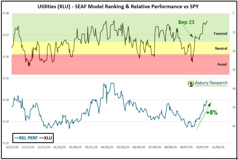 Utilities (XLU) is the SEAF Model’s top-ranked sector this week with a Ranking score of 5, up slightly from 6 a week earlier, and has been one of the top two best-ranked sectors for the past four weeks. The green highlights in Chart 1 below show that Utilities regained Favored status on September 23rd (upper panel), and that XLU has coincidentally outperformed the benchmark S&P 500 (SPY) by 8% since then. Year-to-date, according to sectorspdrs.com, XLU is currently the second-best-performing Sector SPDR ETF, rising by 21.0% while outperforming the S&P 500 (SPY) by 7.7%.