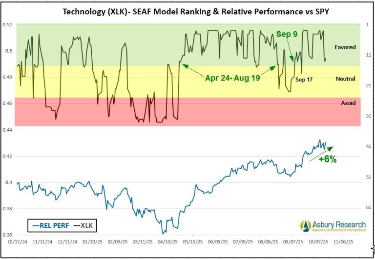 For the fourth consecutive week, the SEAF Model has retained offensive Technology (XLK) and Utilities (XLU) as the two top-ranked sectors, the latter which is now also construed by many as an offensive sector due to the energy demands that AI has thrust upon the market. Communication Services (XLC), another offensive sector, is the third-best-ranked sector this week. At the other end of the spectrum, and for the third consecutive week, economically sensitive Energy (XLE) and cyclical Financials (XLF) are the two worst-ranked sectors.