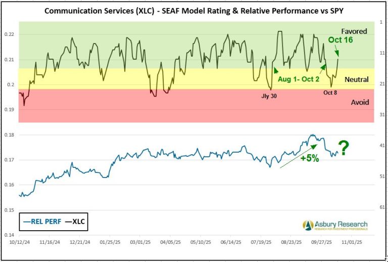 Economically sensitive Communication Services (XLC) is the SEAF Model’s third-best-ranked sector this week with a Ranking score of 13, at the lower edge of Favored status. XLC edged back into Favored status at the end of last week (Oct 16th) after preivously being Favored between Aug 1st and Oct 2nd while XLC outperformed the benchmark S&P 500 (SPY) by 5%. Year-to-date, according to sectorspdrs.com, XLC is the third-best performing Sector SPDR ETF, rising by 18.7% while outperforming SPY by 5.4%.