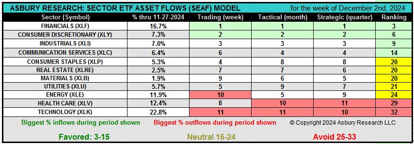 Financials (XLF) and Consumer Discretionary (XLY) continue to maintain their late October/early November top-three SEAF Model rankings while the model added Industrials (XLI) as a new Favored sector this week (although it has been lingering among the top-ranked sectors for more than a month). At the other end of the spectrum, typically offensive Technology (XLK) and defensive Health Care (XLV) are the two worst-ranked sectors this week.