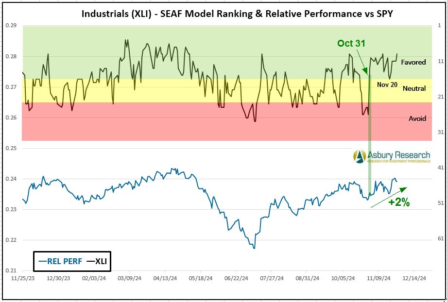 - Effective Monday 12/2, there is a new buy/overweight signal in the Industrial Select Sector SPDR Fund (XLI).