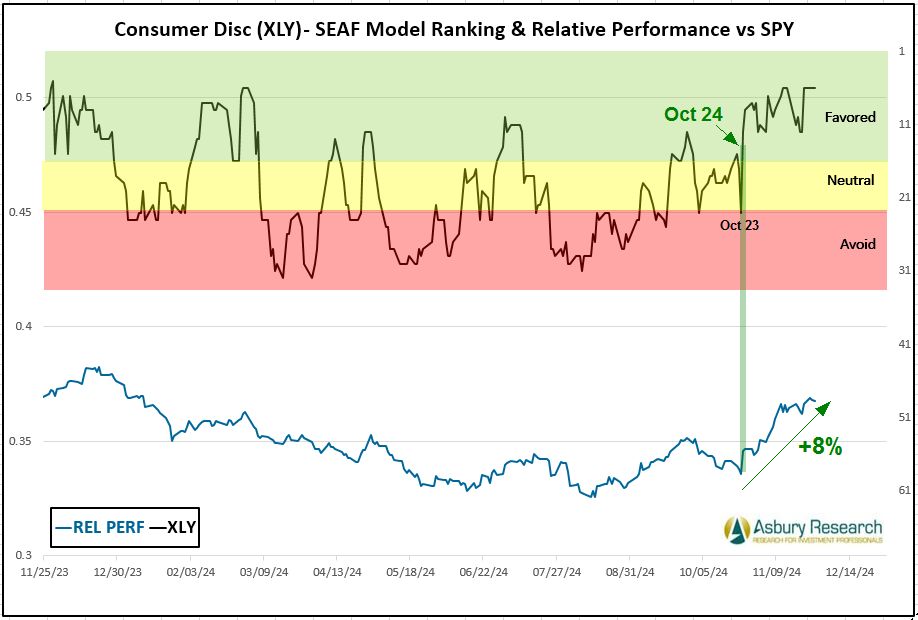 Cyclical Consumer Discretionary (XLY) is the SEAF Model’s second-best-ranked sector this week with a Ranking score of 6. This is the highest/best SEAF Ranking for Consumer Discretionary since February. The green highlights in Chart 2 below show that Consumer Discretionary initially moved into Favored status on Oct 24th while the lower panel shows that XLY has coincidentally outperformed the S&P 500 (SPY) by 8%.