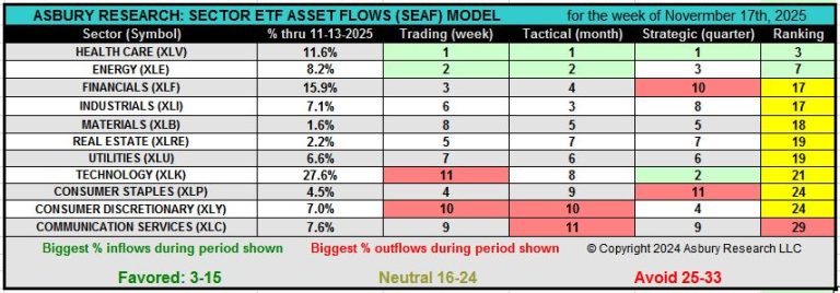 This weekly video by Jack Kosar goes into more detail on the latest SEAF Model data via our SEAF Rainbow Charts and a heat map that provides more color and detail on where sector-related assets are going and where they are coming from across the 11 Sector SPDR ETFs, which together comprise the S&P 500. Our Rainbow Charts highlight SEAF’s previous 12 months of Favored, Neutral, and Avoid rankings.