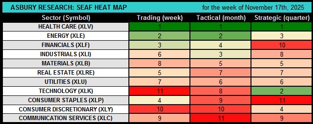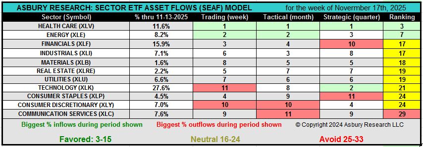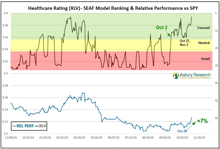 This week, defensive Health Care (XLV) aggressively moved into the top spot according to the SEAF Model with a best-possible Ranking Score of 3. Meanwhile, economically sensitive Energy and cyclical Financials (XLF) moved into the #2 and #3 rankings, replacing more offensive Consumer Discretionary (XLY) and Technology (XLK). Health Care has been one of the top three sectors according to SEAF for five of the past six weeks, beginning on Oct 13th, indicating a subtle shift toward more defensive positioning over the past month as the S&P 500 negotiates psychological resistance at 7000. At the other end of the spectrum, offensive Communication Services (XLC) and Consumer Discretionary (XLY) are the two worst-ranked sectors.