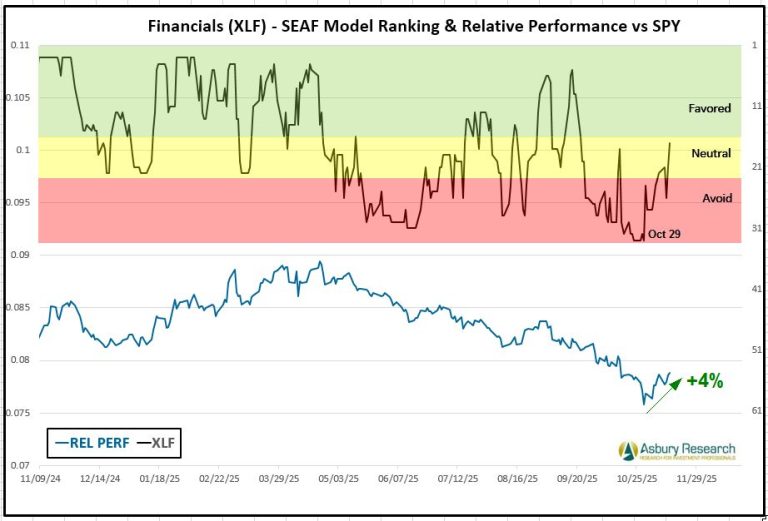 - Effective Monday 11/17, there is a new buy/overweight signal in the Financial Select Sector SPDR Fund (XLF).