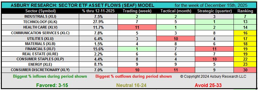 In the SEAF Model Graphic below, the Ranking column sorts the entire table of 11 sector ETFs according to the sum of rankings in the Trading (weekly), Tactical (monthly), and Strategic (quarterly) categories, from largest inflows to largest outflows. The premise of the model is to invest in the sectors where the money is going and to avoid the sectors where the money is coming out.