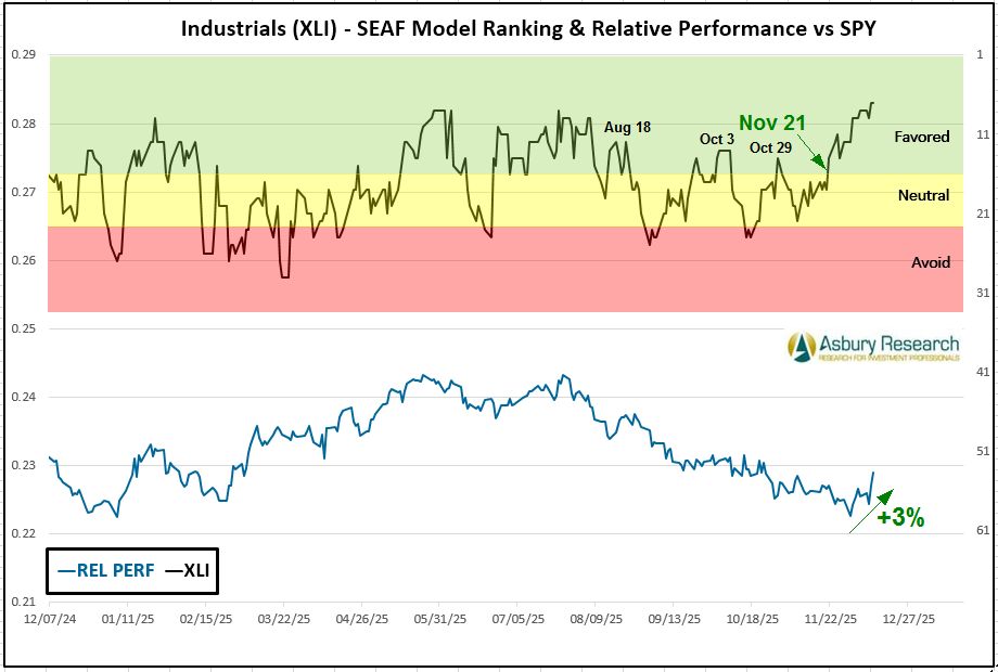 Economically sensitive Industrials (XLI) is the SEAF Model’s top-ranked sector this week with a Ranking score of 10, from 7 a week earlier when it was the second-ranked sector. The upper panel of the chart shows that Industrials initially moved back into Favored status on Nov 21st, following several failed attempts to rise into and remain in Favored status since mid-August. The lower panel shows that XLI has outperformed the benchmark S&P 500 (SPY) by 3.0% since then. Year-to-date (YTD), according to ssga.com, XLI is the third-best-performing Sector SPDR ETF, rising by 19.0% while outperforming SPY by 2.6%.
