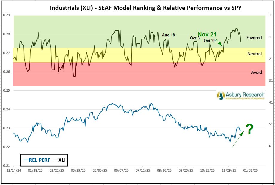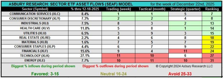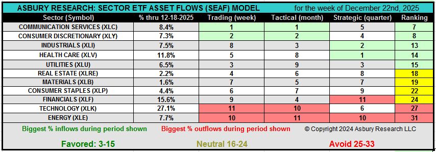 This week, economically sensitive/offensive Industrials (XLI) retains its Dec 1st top-three SEAF Ranking Score for the fourth consecutive week. Meanwhile, also-offensive Communication Services (XLC) and Consumer Discretionary (XLY) jump into the top two SEAF rankings based on abrupt weekly changes to asset flows. The common theme of erratic 2025 sector rotation has been politically driven indecision regarding the implementation of tariffs, emerging changes to previously solid 75-year trade relationships, and the direction of interest rates as it pertains to the future independence of the Federal Reserve. Until these conditions change, sector rotation is likely to remain bumpy. At the other end of the spectrum, 2025 trailer Energy (XLE) and 2025 leader Technology (XLK) are the two weakest sectors this week, according to SEAF.