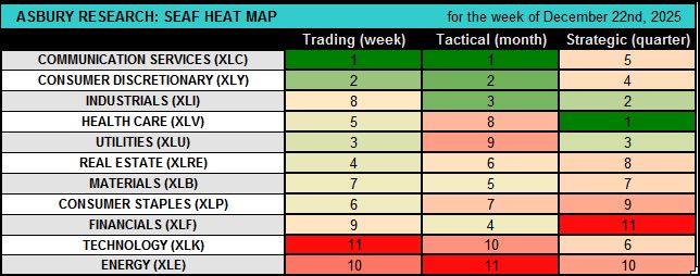 - The SEAF Model exited it’s 12/15 long/overweight signal in the Health Care Select Sector SPDR Fund (XLV) on 12/19 for a 0.5% outright gain while underperforming the S&P 500 (SPY) by 1.1%.
