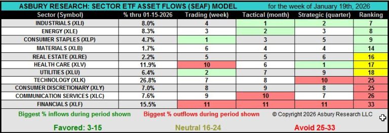 This weekly video by Jack Kosar goes into more detail on the latest SEAF Model data via our SEAF Rainbow Charts and a heat map that provides more color and detail on where sector-related assets are going and where they are coming from across the 11 Sector SPDR ETFs, which together comprise the S&P 500. Our Rainbow Charts provide a daily 12-month lookback at SEAF’s previous Favored, Neutral, and Avoid rankings.