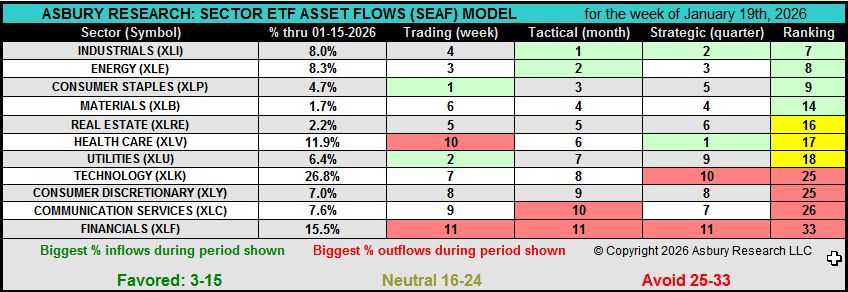 In the SEAF Model Graphic below, the Ranking column sorts the entire table of 11 sector ETFs according to the sum of rankings in the Trading (weekly), Tactical (monthly), and Strategic (quarterly) categories, from largest inflows to largest outflows. The premise of the model is to invest in the sectors where the money is going and to avoid the sectors where the money is coming out.