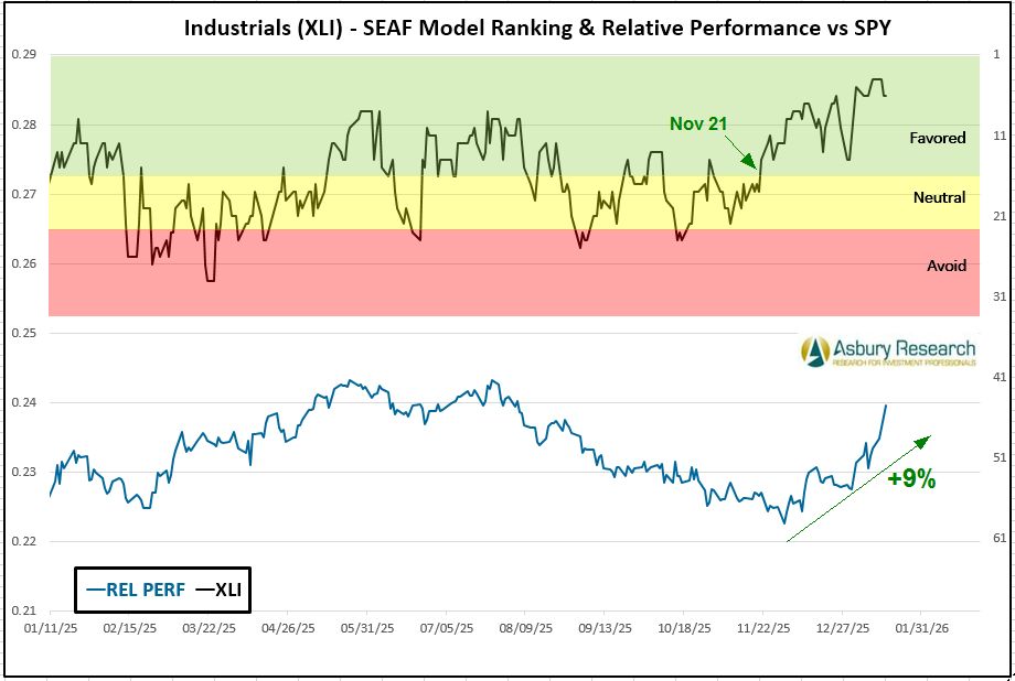 Economically sensitive Industrials (XLI) is the SEAF Model’s top-ranked sector this week, with a Ranking score of 7, up slightly from a score of 5 a week earlier. Industrials initially moved into Favored status on Nov 21st, as shown in the upper panel of Chart 2 below, and has been one of the top-three ranked sectors according to SEAF for the past eight weeks beginning on Dec 1st. During this period, XLI has risen by 10.4% outright while outperforming the benchmark S&P 500 (SPY) by 8.9%. On a trailing 12-month basis, according to ssga.com, XLI is the best-performing Sector SPDR ETF, rising by 21.2% while outperforming the State Street® SPDR® Portfolio S&P 500® ETF (SPYM) by 7.8%.