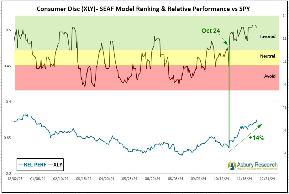 Cyclical Consumer Discretionary (XLY) is the SEAF Model’s best-ranked sector this week with a Ranking score of 6. The upper panel of the chart below shows that this is the best (lowest number) SEAF Ranking for Consumer Discretionary since February. The green highlights in Chart 1 below show that Consumer Discretionary initially moved into Favored status on Oct 24th while the lower panel shows that XLY has coincidentally outperformed the S&P 500 (SPY) by 8%.