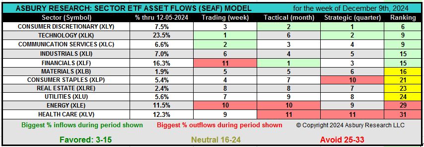 In the SEAF Model Graphic below, the Ranking column sorts the entire table of 11 sector ETFs according to the sum of rankings in the Trading (weekly), Tactical (monthly), and Strategic (quarterly) categories, from largest inflows to largest outflows. The premise of the model is to invest in the sectors that the money is going into and to avoid the sectors the money is coming out of.