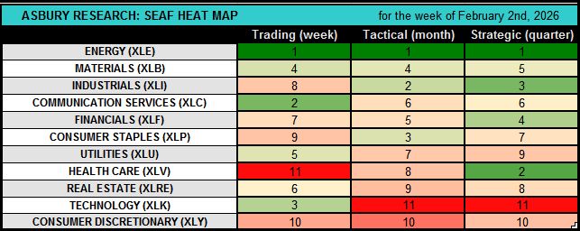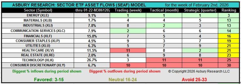 This weekly video by Jack Kosar goes into more detail on the latest SEAF Model data via our SEAF Rainbow Charts and a heat map that provides more color and detail on where sector-related assets are going and where they are coming from across the 11 Sector SPDR ETFs, which together comprise the S&P 500. Our Rainbow Charts provide a daily 12-month lookback at SEAF’s previous Favored, Neutral, and Avoid rankings.